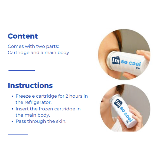 The new concept of refreshing massager with frost cartridge. I’M so cool, helps you keep your skin cool, performing a cold massage, the best way to calm the skin. What is ¿I’M SO COOL? Eliminates inflammation, contracts skin and pores, and relieves redness.